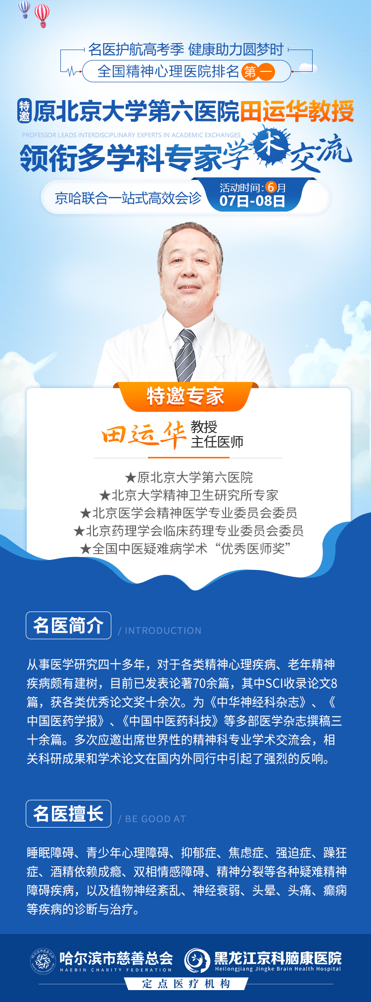 在孩子們經(jīng)歷高考這場(chǎng)身心巨變的關(guān)鍵時(shí)刻,6月7日-8日(僅兩天!),我們鄭重邀約原北京大學(xué)第六醫(yī)院精神科權(quán)威專(zhuān)家田運(yùn)華教授親臨本院,開(kāi)展特別會(huì)診活動(dòng)。
